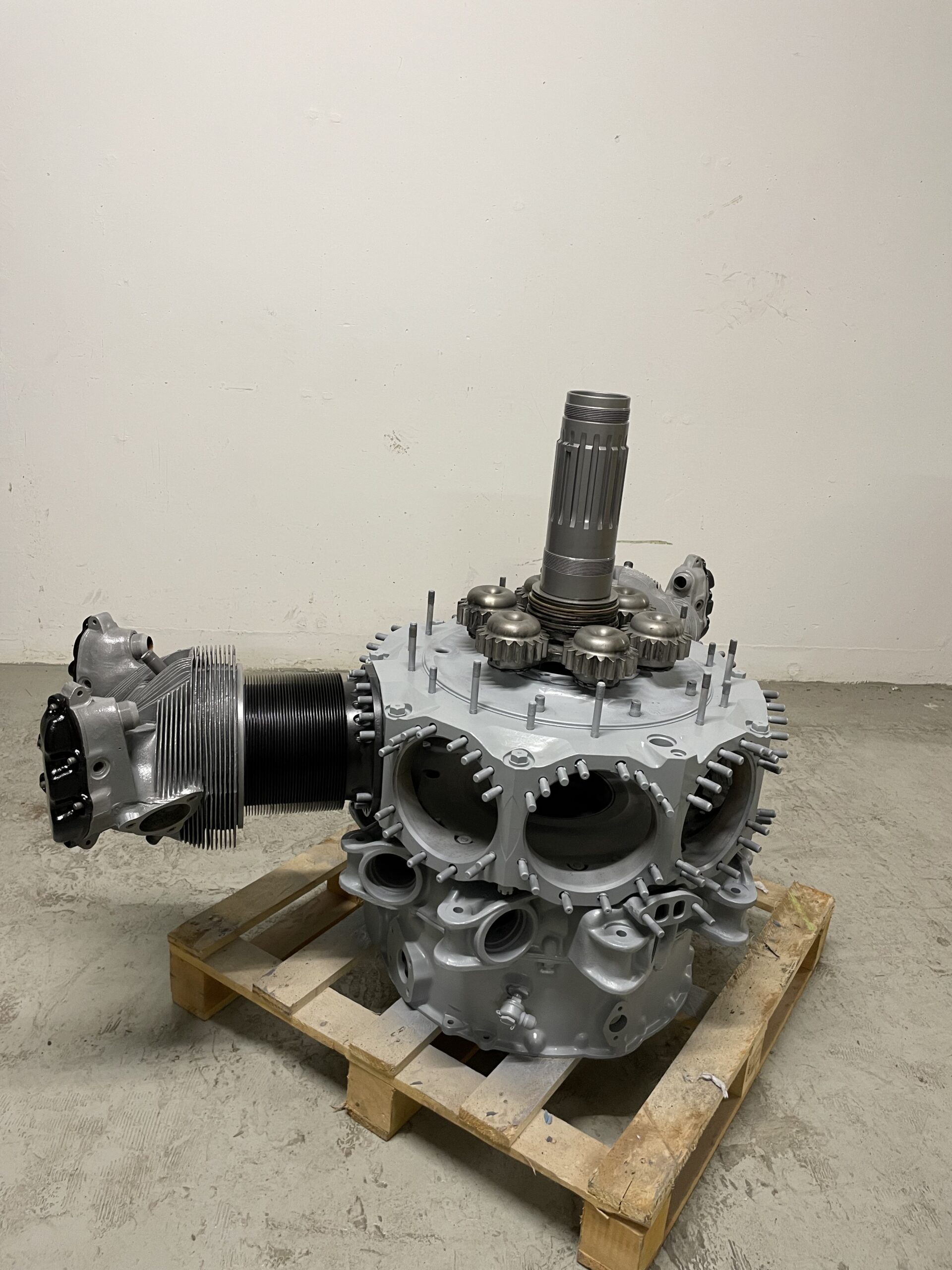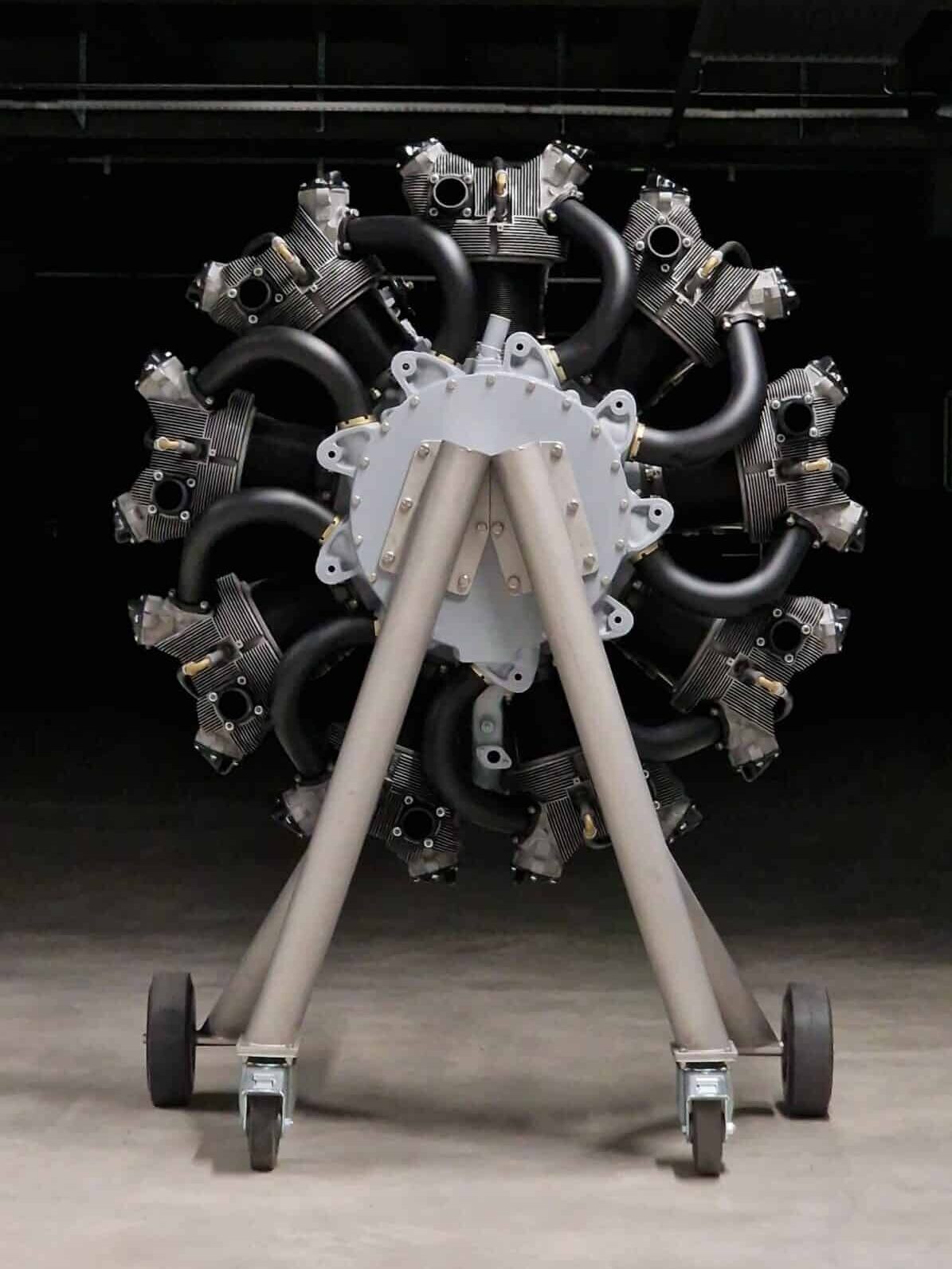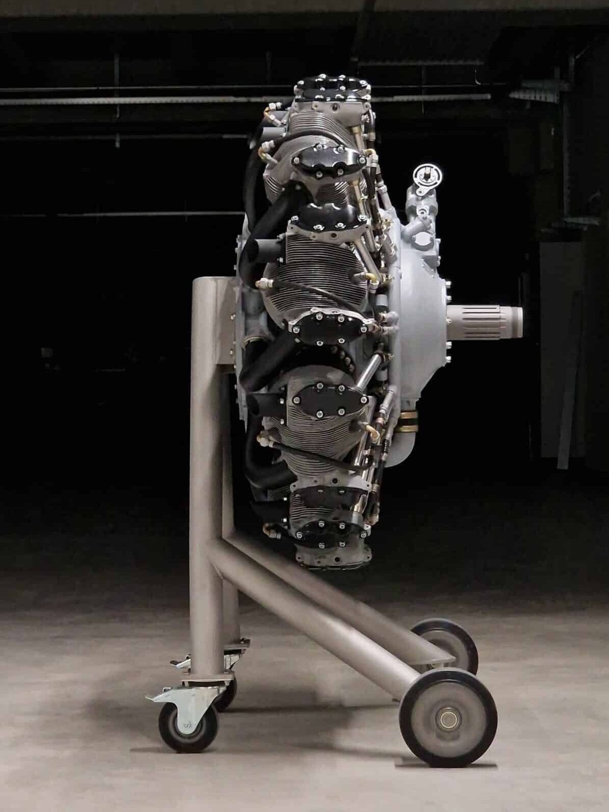 Dafür haben wir selbst ein speziell angefertigtes Gestell entworfen und gefertigt, das an ein Flugzeugfahrwerk erinnert. Der Motor ist einseitig aufgehängt, sodass die Vorderseite uneingeschränkt sichtbar ist und in voller Pracht bewundert werden kann. Ein aussergewöhnliches Projekt, das Technik und Ästhetik auf einzigartige Weise vereint.