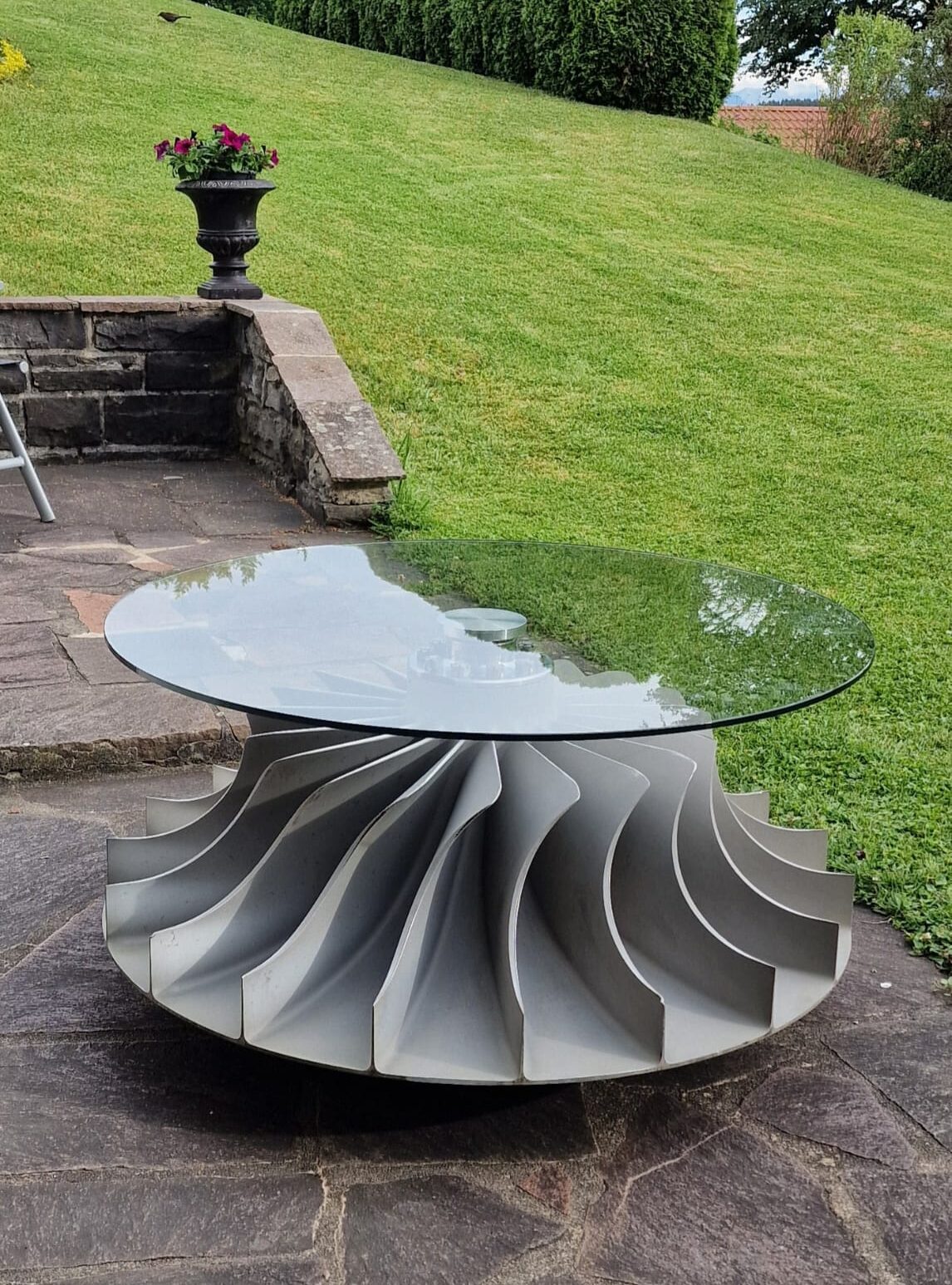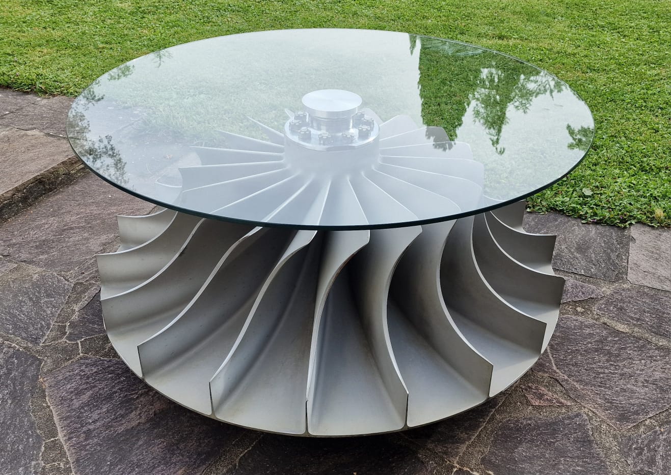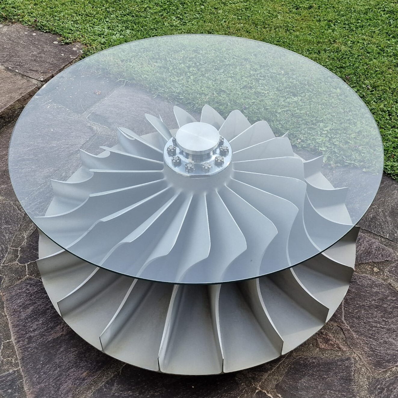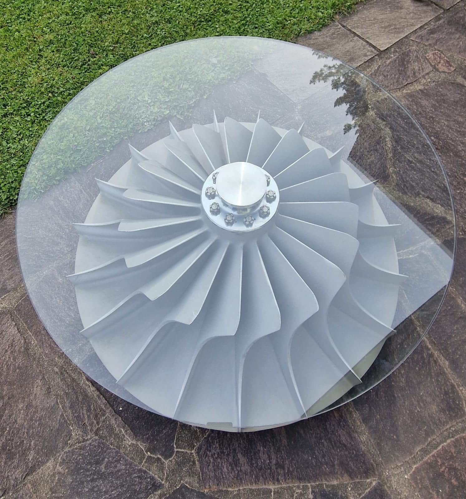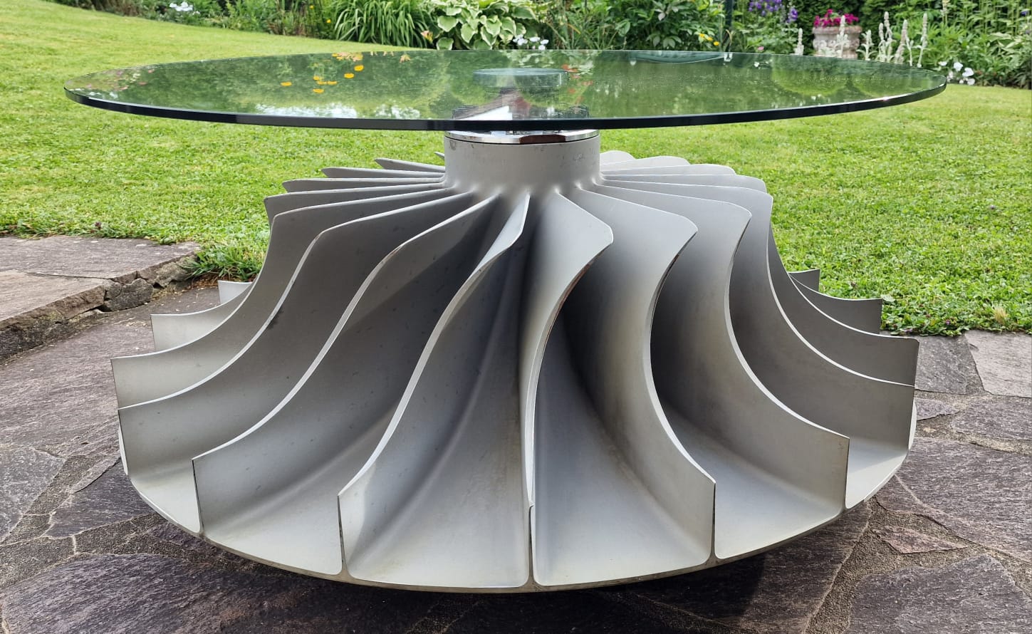 Die charakteristischen, spiralförmig geschwungenen Schaufeln des Verdichterrads verleihen dem Tisch eine dynamische, fast skulpturale Wirkung. Jede Perspektive zeigt ein Stück Luftfahrtgeschichte, vereint mit modernem Industrial-Design.
